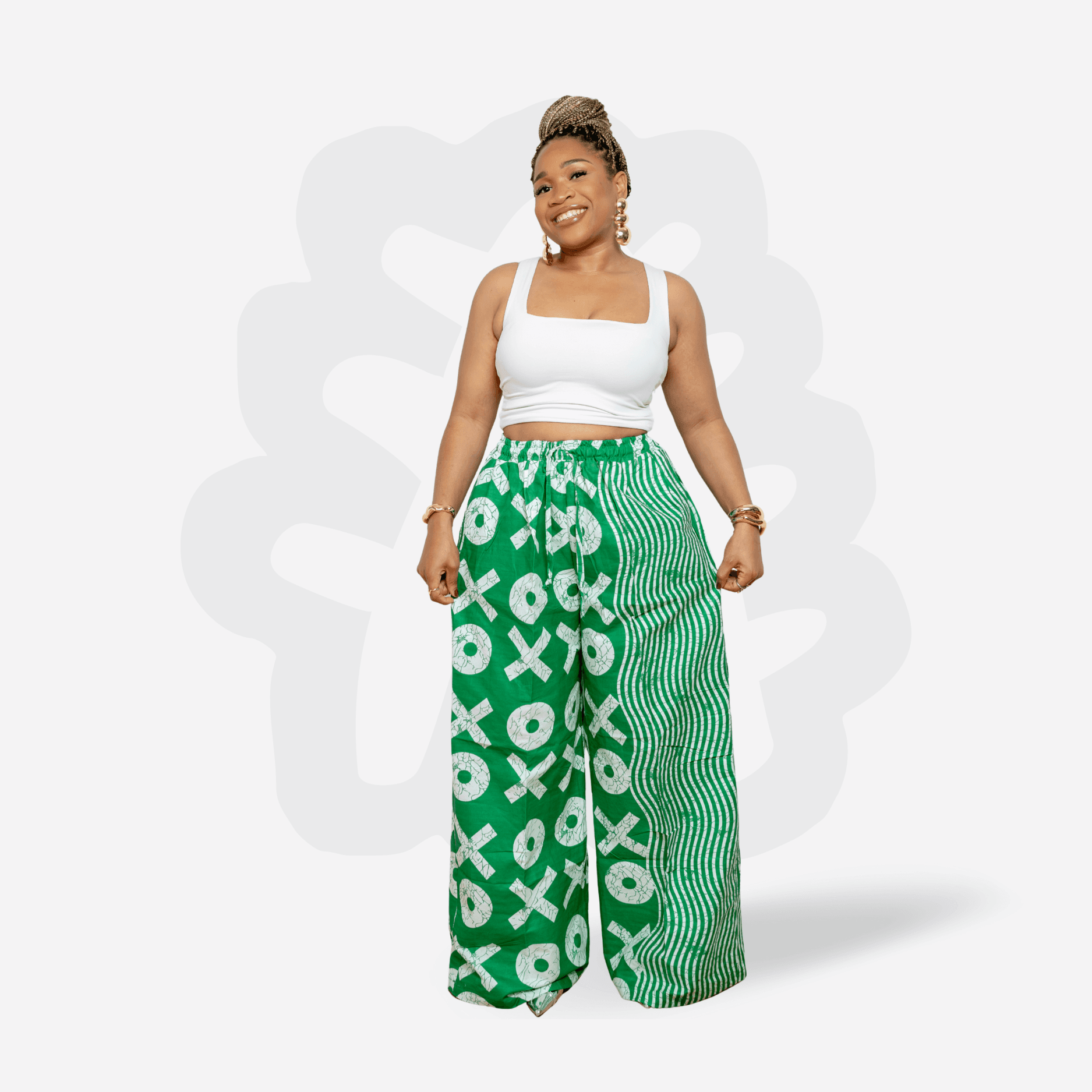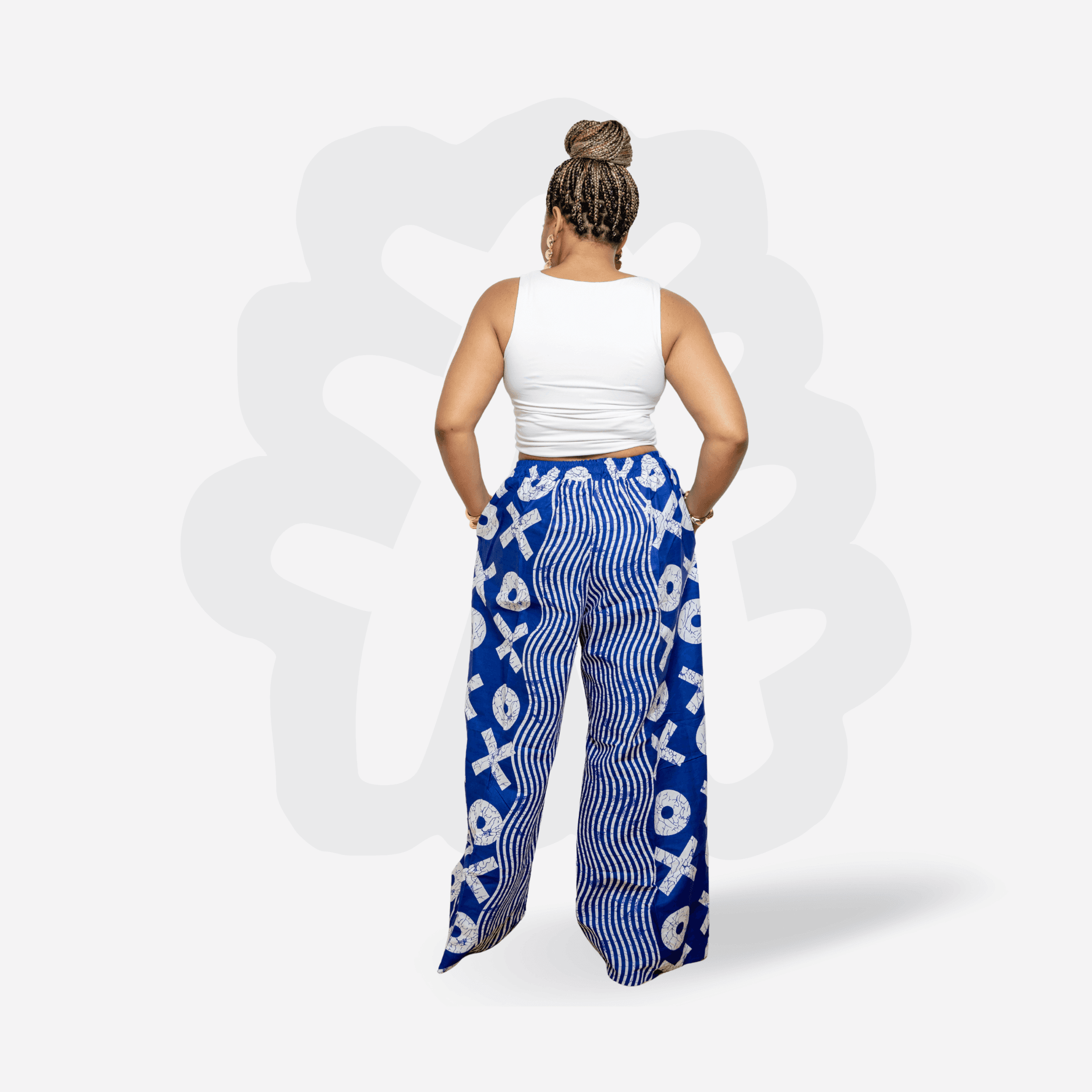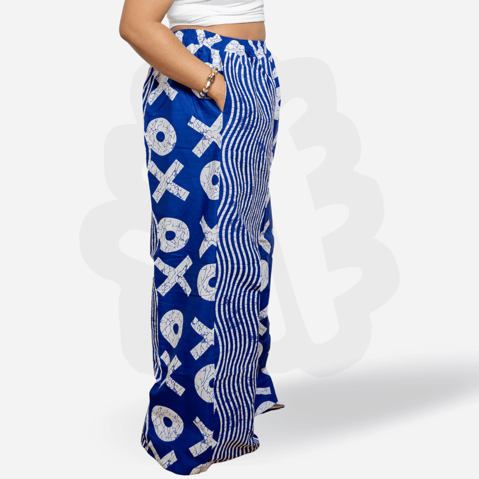 Elevate your wardrobe with the Traba Ankara Palazzo Trousers, a bold fusion of cultural heritage and modern flair. Designed for comfort and confidence, these wide-leg trousers feature a stunning mix of traditional Adire-inspired XOXO and stripe patterns in rich indigo blue.
